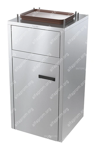 Станция сбора отходов ATESY ССО-240-01 используется на предприятиях общественного питания и в ресторанах самообслуживания для сбора пищевых отходов, одноразовой посуды и упаковки от фастфуда, а также для временного хранения использованных подносов. Модель состоит из тумбы и служащей мусороприемником внутренней емкости на колесах, используемой совместно с мешком для мусора. Тумба и емкость выполнены из шлифованной легированной стали.