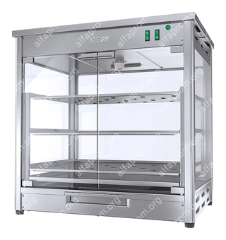 Тепловая​ витрина ATESY ВК-4 Э используется на предприятиях общественного питания и торговли для кратковременного хранения и демонстрации приготовленных тушек или частей кур, горячих закусок и вторых блюд в горячем виде. Модель оснащена 3 выдвижными перфорированными полками для выкладки продуктов и готовых блюд. Каркас и полки выполнены из пищевой нержавеющей стали AISI 430, корпус - из стекла.